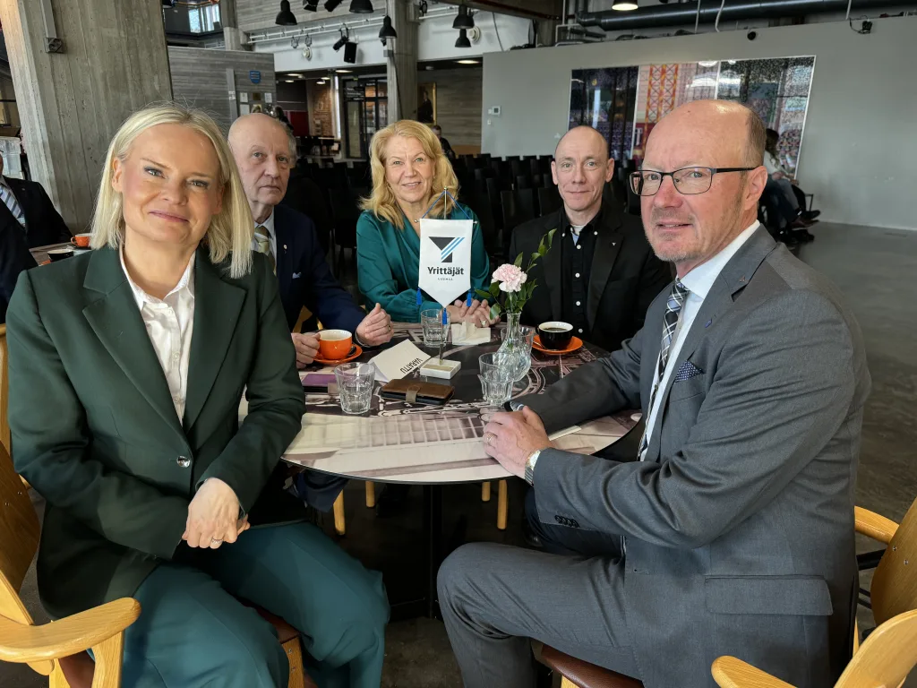 Puheita edeltäneellä lounaalla ovat kahvittelemassa valtiovarainministeri Riikka Purra, Hyvinkään Yrittäjien puheenjohtaja Jarmo Mikkonen, Hyvinkään kaupunginjohtaja Johanna Luukkonen, Uudenmaan Yrittäjien puheenjohtaja Mikko Ahtiainen ja Hyvinkään kaupunginvaltuuston puheenjohtaja Antti Rantalainen.
