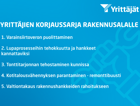 Suomen Yrittäjät esittää varainsiirtoveron puolittamista määräajaksi, kotitalousvähennyksen korotusta remonttien vauhdittamiseksi ja valtiontakausta rakennushankkeiden rahoitukseen. ”Rakentamisen orastava elpyminen on pysähtynyt talouden…