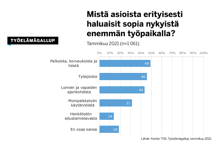 Työelämässä olevat haluaisivat sopia työpaikoilla palkoista, korvauksista ja lisistä (49 %), työajoista (46 %), sekä lomien ja vapaiden ajankohdista (44 %) enemmän kuin nyt. Lähes kolmannes (31 %) haluaisi sopia monipaikkatyön käytännöistä.