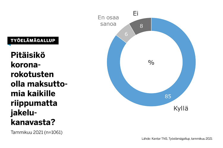 Suomalaiset odottavat koronarokotuksia. 68 prosenttia työelämässä olevista haluaa, että myös yksityiset terveysyritykset otetaan mukaan rokottamaan. Maksuttomuutta jakelukanavasta riippumatta vaatii 85 prosenttia työllisistä.