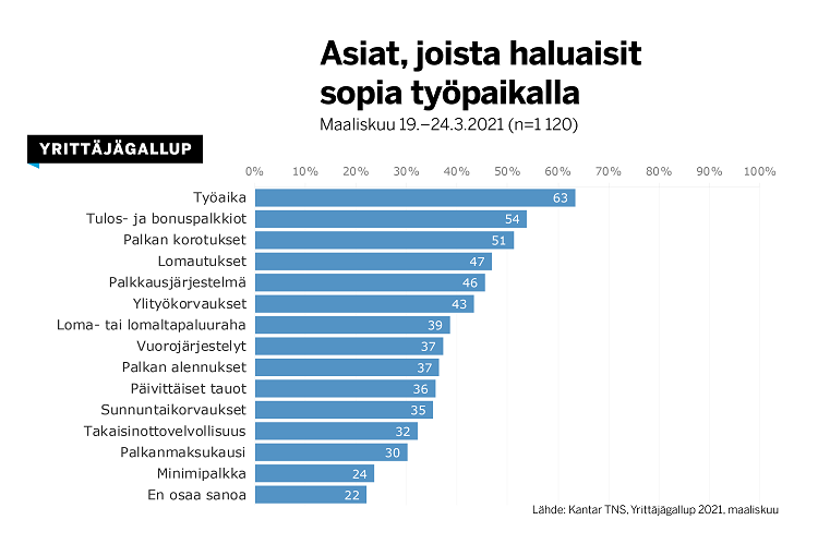 Selvästi eniten halutaan sopia työajoista (63 %). Sen jälkeen tulee palkkaan liittyviä asioita, kuten tulos- ja bonuspalkkiot (54 %) ja palkan korotukset (51 %).