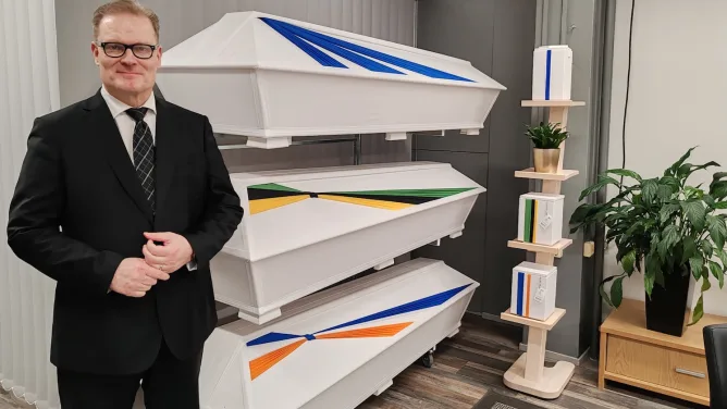 Marko Mielosen hautauspalvelussa on tarjolla Tapparan tai Ilveksen tunnusvärein verhoiltuja arkkuja.
