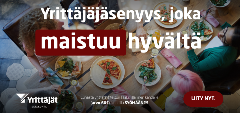 Liity nyt Yrittäjien jäseneksi Satakunnassa koodilla SYÖMÄÄN25 ja saat 60€ arvoisen lahjakortin valitsemaasi ravintolaan Satakunnassa. Kampanja on voimassa 3.11.-16.11.2025 välillä liittyville uusille jäsenille. Tämä on täydellinen hetki liittyä yrittäjäjärjestöön, joka valvoo sinun etuasi, tarjoaa huikeita etuja sekä virkistäviä tapahtumia. Luethan liittymisehdot alempaa.