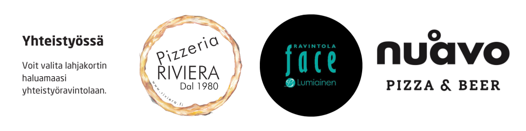 Huom. Noudatathan liittymisohjeita. Edellytyksenä lahjakortin saamiselle on jäsenmaksun maksaminen liittymisen ohessa. Liittymisen jälkeen otamme sinuun yhteyttä ja saat valita lahjakortin valitsemaasi ravintolaan (Nuåvo, Ravintola Face tai Pizzeria Riviera). Lahjakortit lähetetään kaikille liittyneille ja jäsenmaksun maksaneille postitse kampanjan päätyttyä 18.-25.11.2025 välisenä aikana.