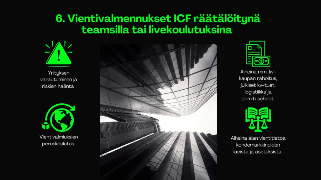 Vientivalmennukset ICF räätälöitynä teamsilla tai livekoulutuksina Seuraavaksi Vientimatkat Palaa etusivulle