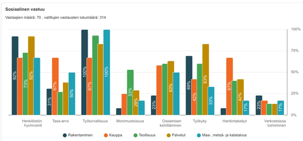 Rakentamisen alan pk-yritykset painottavat ennen kaikkea työturvallisuutta osana sosiaalisen vastuullisuuden toimiaan. Kaikki alan vastaajat (100 %) ilmoittivat työturvallisuuden olevan olennainen vastuullisuusteema, ja 92 % mainitsi henkilöstön hyvinvoinnin. Sen sijaan yhdenvertaisuus ja monimuotoisuus eivät rakentamisessa korostu, jolloin vain noin 8 % rakennusalan vastaajista mainitsi monimuotoisuuden käytännössä toteutettavana vastuullisuustoimenaan.