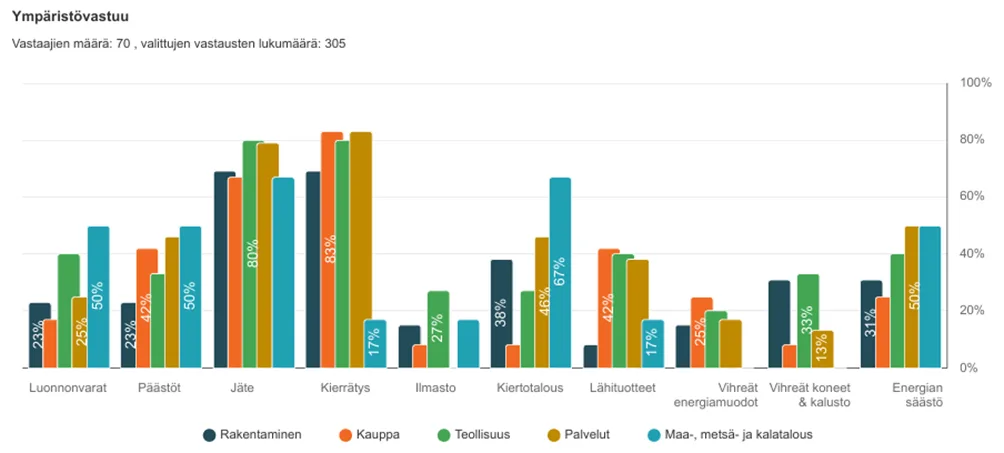 Ympäristövastuu on vastausten perusteella luonteva ja käytäntöön viety osa arkea maa- ja metsätalousyrityksissä. Alan vastaajat esimerkiksi kertoivat hyödyntävänsä luonnonvaroja mahdollisimman tehokkaasti, muun muassa kierrättämällä sivuvirtoja ja panostamalla kiertotalouteen. 67 % alan vastaajista mainitsi kiertotaloustoimet, joka on korkein osuus kaikista tarkastelun alla olleista toimialoista.