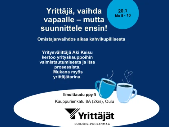 Tervetuloa omistajanvaihdoskaffeille keskustelemaan yrityksen myyntiin ja yrityskauppaan valmistautumisesta rennossa aamun tunnelmassa. Klo 8.00 aloitamme kahveilla ja vapaalla jutustelullaKlo 8.30–10.00 Aki…
