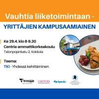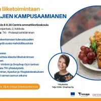 Lämpimästi tervetuloaYrittäjien kampusaamiaiselle! Tule tutustumaan kolmeen alueen koulutusorganisaatioon ja löydä uusia mahdollisuuksia yhteistyöhön. Paikalla ovat kaikkien oppilaitosten edustajat, ja kokonaisuus…