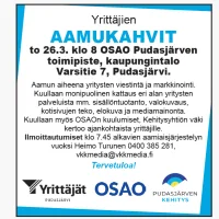 Yrittäjien AAMUKAHVIT to 26.3. klo 8 OSAO Pudasjärven toimipiste, kaupungintalo Varsitie 7, Pudasjärvi.