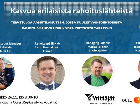 Keskiviikko 26.11. klo 8.30–10.00, Technopolis Oulu (Reykjavik-kokoustila)Kahvitarjoilu ja pientä purtavaa klo 8.00 alkaen Yrittäjän rahoitusmahdollisuudet ovat monipuolisemmat kuin koskaan. Järjestämme…