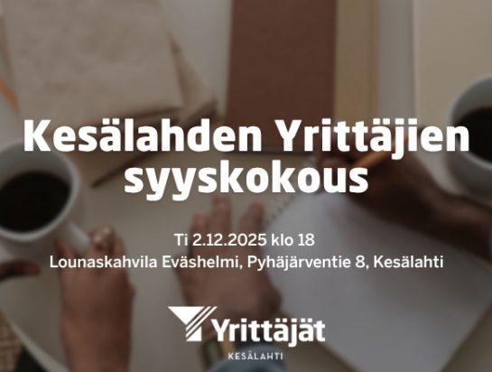 Tervetuloa mukaan Kesälahden Yrittäjien syyskokoukseen! Kokouksessa käsitellään yhdistyksen sääntömääräiset asiat ja valitaan hallitus vuodelle 2026. 📅 Aika: Tiistaina 2.12.2025 klo 18📍 Paikka: Lounaskahvila Eväshelmi…