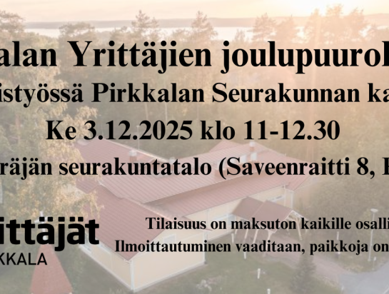 Tervetuloa Pirkkalan yrittäjien ja Pirkkalan seurakunnan yhdessä järjestämään lounastilaisuuteen nauttimaan joulupuurosta, kahvista ja tortuista, verkostoitumaan sekä kuulemaan yritysesittelyä ja yrittäjille…