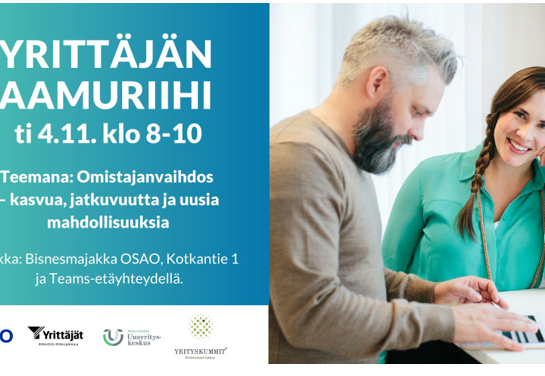 OSAO Bisnesmajakka, Kotkantie 1 sekä Teams-etäyhteydellä Ohjelma: 7.45 Aamukahvi aloitus paikan päälle saapuvilla 8.00 Tervetuloa 8.05 Yrityksestä luopumisen tarina. Kaksi…