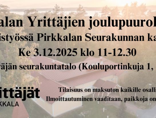 Tervetuloa Pirkkalan yrittäjien ja Pirkkalan seurakunnan yhdessä järjestämään lounastilaisuuteen nauttimaan joulupuurosta, kahvista ja tortuista, verkostoitumaan sekä laskeutumaan joulunvieton tunnelmaan yhdessä…