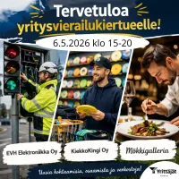 Yritysvierailukierros 6.5.2026 - Yritysten Kaarina 🚍 Lähde mukaan inspiroivalle matkalle Tutustumme Kaarinassa toimiviin yrityksiin EVH Elektrotekniikka Oy, Kiekkokingi Oy ja Mökki…