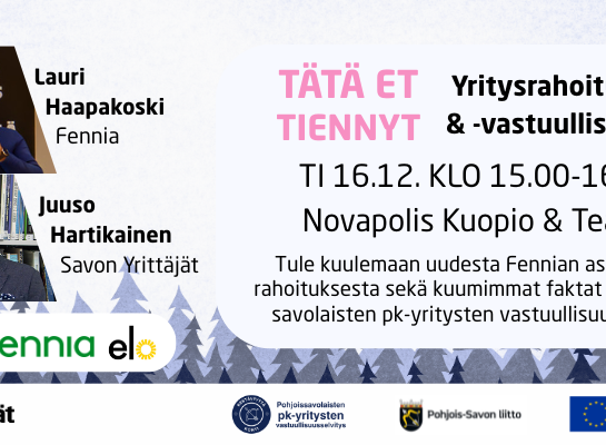 Tule kuulemaan uudesta Fennian asiakasrahoituksesta sekä kuumimmat faktat pohjoissavolaisten pk-yritysten vastuullisuudesta! Savon Yrittäjien glögin makuisessa joulukuun infotilaisuudessa luvassa tulikuuma paketti…