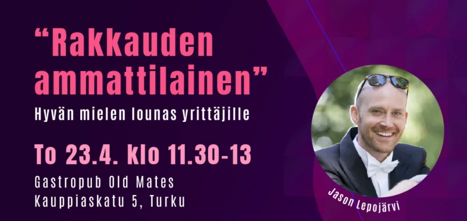 Enjoy a delicious lunch, free networking, and an interesting introduction led by love expert Jason Lepojärvi! Music will be provided by troubadour JP Suominen.