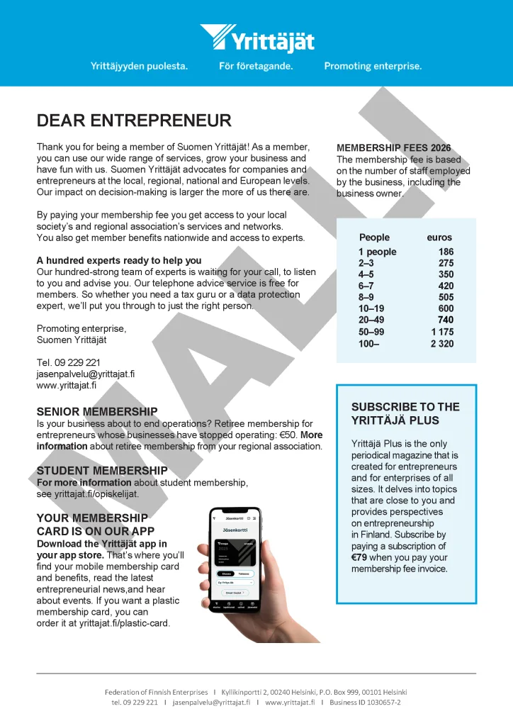 The invoice will be sent in the language that has been marked as the language of your business. You can choose the service language: Finnish, Swedish or English. You can change the delivery method and the language of the invoice in the user information of the membership service, under business profile. The paper invoice surcharge of €6 will be added to membership fees of Suomen Yrittäjät if the invoices are sent out in paper format. If you are a retiree member, the paper invoice surcharge will not apply to you. You can read more about the paper invoice surcharge here.