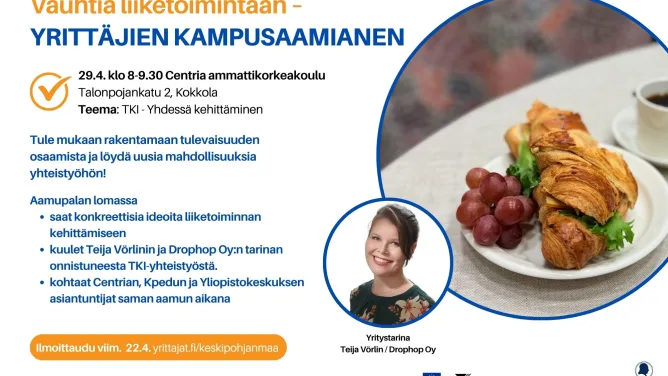 Vuodessa järjestetään lukuisia yrittäjätapahtumia. Tapahtumistamme saat ajankohtaista tietoa, eväitä yritystoimintaasi sekä uusia kontakteja verkostoosi. Tule rohkeasti mukaan!
