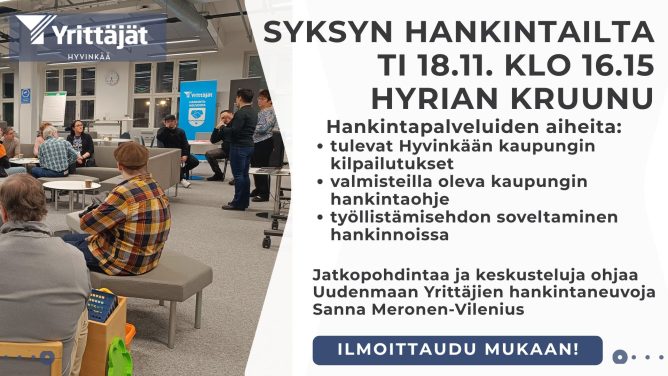 Hyvinkään Yrittäjien strategisiin linjauksiin kuuluu toimia kiinteässä yhteydessä Hyvinkään kaupungin toimijoiden kanssa. Niin kaupungin johdon, elinkeinotoimen kuin virkamiestenkin kanssa miellä on hyvät yhteydet. Yhdistys mm osallistuu erilaisiin yritystoimintaa tukeviin hankkeisiin ja antaa lausuntoja ja kannanottoja kaupungin kehitykseen liittyvistä hankkeista ja päätöksistä. Tavoitteena on kehittää entistä vetovoimaisempaa ja kilpailukykyisempää yritystoimintaympäristöä, sekä elinvoimaisempaa, viihtyisämpää ja toimivampaa kaupunkia kaupunkilaisille. Liittyessäsi Suomen yrittäjiin https://www.yrittajat.fi/yrittajajarjesto/liity-jaseneksi/ kuulut yhdellä jäsenmaksulla sekä Uudenmaan yrittäjiin, että Hyvinkään yrittäjiin ja hyödynnät kaikki jäsenpalvelut https://www.yrittajat.fi/neuvontapalvelut/