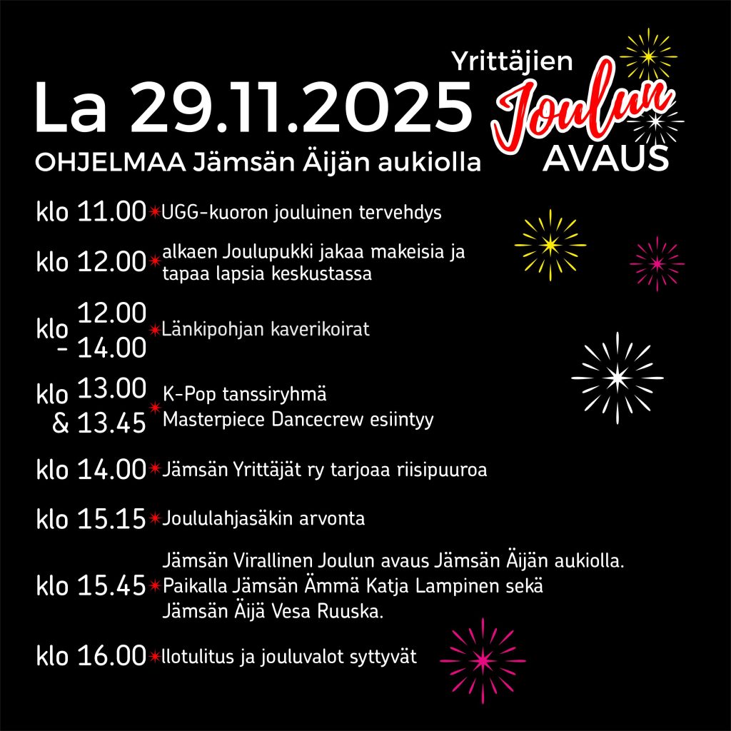 Jämsässä syttyy taas la 29.11.2025 joulun kipinä, kun yrittäjät avaavat juhlan koko kaupungin iloksi!