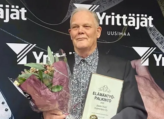 Jokelalainen metallialan yrittäjä Jouko Vuori on palkittu Uudenmaan Yrittäjien Elämäntyöpalkinnolla. Palkinto on vertaisten myöntämä kunnianosoitus poikkeuksellisen pitkästä ja merkittävästä työstä yrittäjänä.