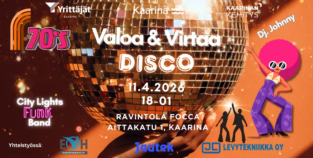 Lauantaina 11.4. kaarinalaiset yrittäjät ja kaupunki kohtaavat Ravintola Foccan parketilla peilipallojen välkkeessä ✨. Savusta nousee City Lights Funk Band ja Dj. Johnny hoitelee loppuillan.