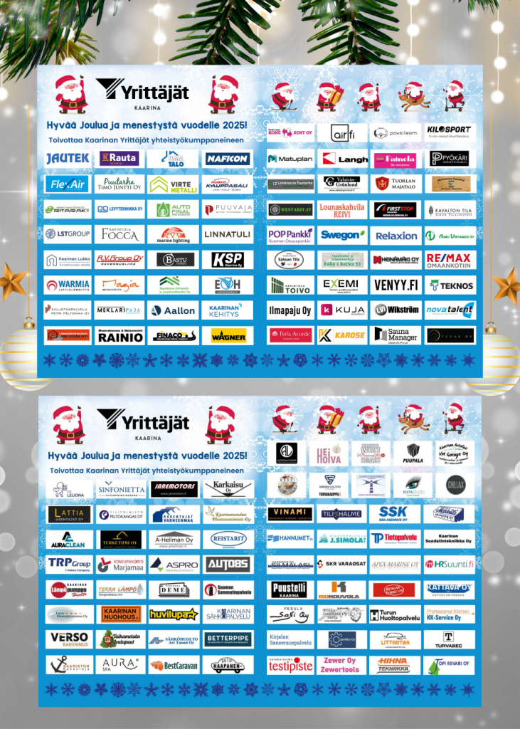 Kaarinan Yrittäjät julkaisee edellisten vuosien tapaan joulutervehdyksen Kaarina-lehdessä (laaja jakelu) keskiviikkona 3.12. Kaarinalaiset yritykset ja yhdistyksen yhteistyökumppanit voivat osallistua tervehdykseen yrityksensä logolla hintaan 120 € (alv 0%).