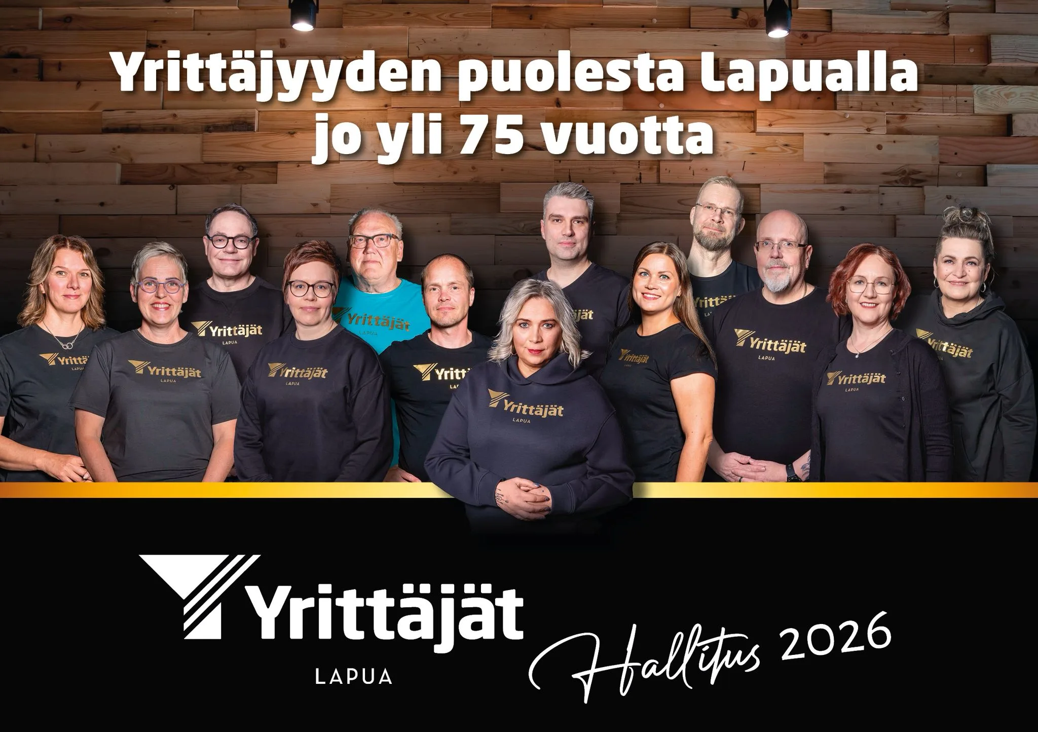 Lapuan Yrittäjät Tervetuloa sivuillemme! Olemme lapualaisten yrittäjien aktiivinen yhteisö. Uskomme yrittäjyyteen ja luomme työtä ja tulevaisuutta. Tule mukaan toimintaamme, yhdessä olemme enemmän! Liity Yrittäjiin LAPUAN YRITTÄJÄT RY & SAARIKOSKI TRAVELS JÄRJESTÄÄ SOKKOMATKAN 7.-8.2.2026Lue lisää tästä linkistä ja ilmoittaudu mukaan! Tutustu palveluihimme Valtakunnalliset jäsenedut Jäsenedut Lapualla Tule mukaan tapahtumiimme Katso paikalliset, alueelliset ja valtakunnalliset tapahtumamme ja koulutuksemme tästä. Tapahtumiin Lue tuoreimmat yrittäjäuutiset Paikalliset, alueelliset ja valtakunnalliset uutisemme kertovat, mitä tapahtuu ja mitä yrittäjien tulee tietää juuri nyt. Lue uutisia