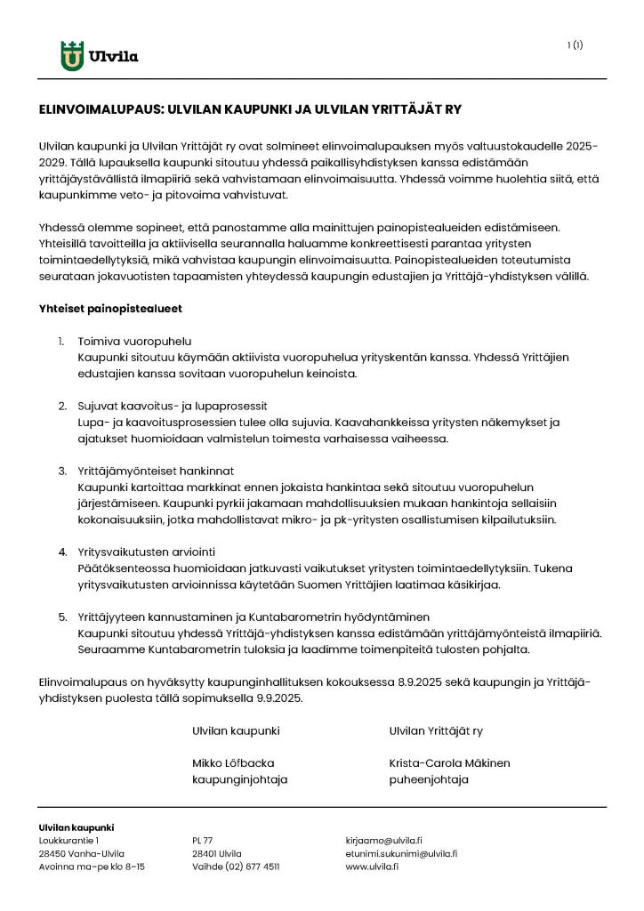 Ulvilan kaupunki ja Ulvilan Yrittäjät ry ovat solmineet elinvoimalupauksen myös valtuustokaudelle 2025-2029. Tällä lupauksella kaupunki sitoutuu yhdessä paikallisyhdistyksen kanssa edistämään yrittäjäystävällistä ilmapiiriä sekä vahvistamaan elinvoimaisuutta. Yhdessä voimme huolehtia siitä, että kaupunkimme veto- ja pitovoima vahvistuvat.