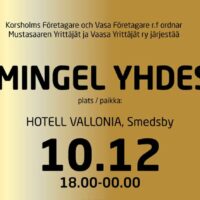 Företagarna i Vasa och Korsholm ordnar tillsammans ett julmingel på Hotel Valloinia den 10.12. klockan 18.00. Det blir julmat, nätverksbyggande…