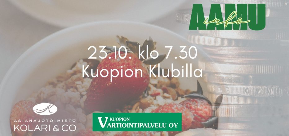 Tervetuloa Kuopion Klubin herkullisen aamiaisen äärelle 23.10. kuulemaan ja keskustelemaan Kuopion Vartiointipalvelun toimitusjohtaja Mika Kolehmaisen kanssa aiheesta uhkatilanteet, ja Asianajotoimiston Kolarin Ville Heikinheimon kanssa aiheesta asianajotoimiston käyttö, kysymyksiä ja vastauksia.