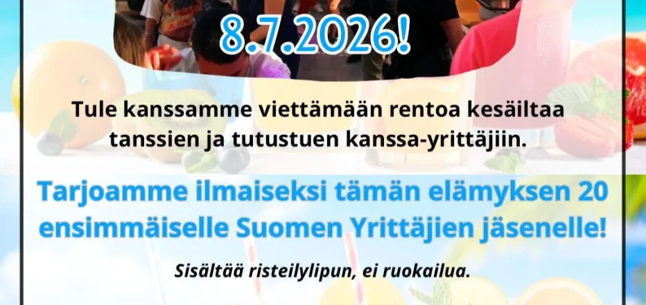 Tervetuloa viettämään kesäiltaa merelle yhdessä muiden yrittäjien kanssa! Luvassa on rentoa tunnelmaa, musiikkia, tanssia ja ennen kaikkea hyvää seuraa.
