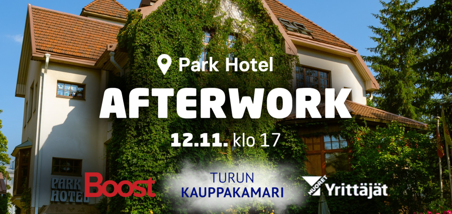 Tervetuloa Afterworkeille Park Hotel Turkuun keskiviikkona 12.11. klo 17.00! Tapahtuman järjestää V-S Nuoret Yrittäjät, Boost Turku, Turun Kauppakamari sekä Turun Yrittäjät.