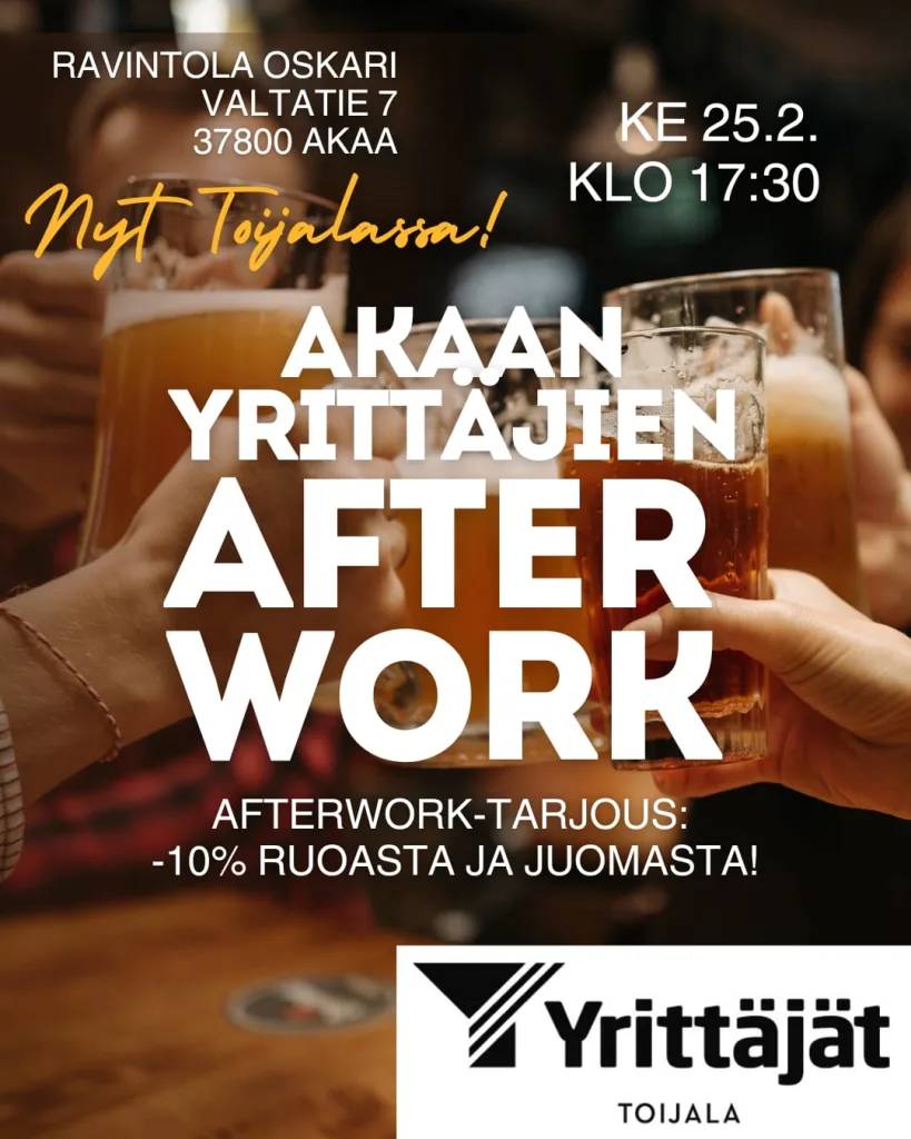 Akaan yrittäjien avoimet Afterworkit järjestetään keskiviikkona 25.2.2026 klo 17.30 Ravintola Oskarissa. Verkostoitua saa niin pitkään kuin haluaa tai ravintolan sulkeutumiseen eli klo 21 saakka.