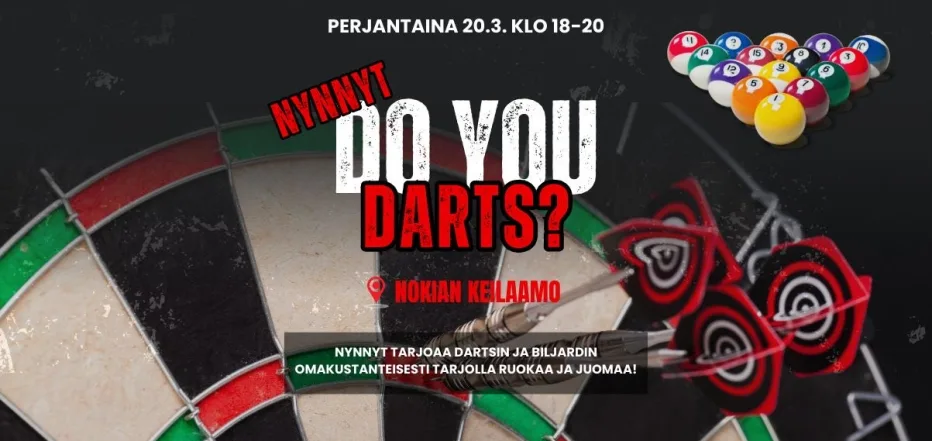 Huipputrendikäs Darts on vallannut myös Nokian ja lähdemme sitä nuorten yrittäjien kanssa testaamaan! Meille on varattu koko Nokian Keilaamon Darts huone perjantaille 20.3. klo 18-20. Darts huoneessa tunnelma on tiivis, joten lisäksi meille on varattu Keilaamon alakerran bilispöytä.