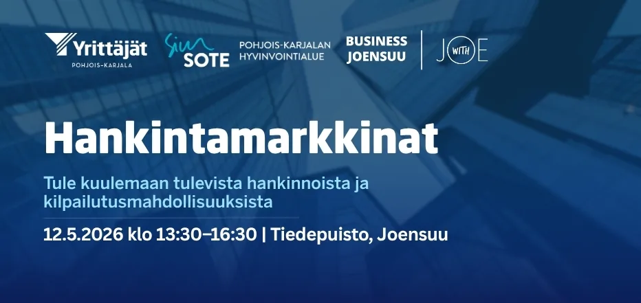 Hankintamarkkinat järjestävät Business Joensuu Oy, Pohjois-Karjalan hyvinvointialue ja Pohjois-Karjalan Yrittäjät. Ilmoittaudu mukaan viimeistään maanantaina 4.5. Lisätiedot ja ilmoittautumiseen liittyvät asiat p. 050 448 8468 tai joonas.hiltunen@yrittajat.fi.
