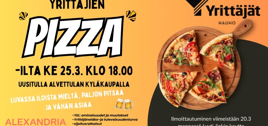 Hauho Yrittäjien ja Alexandrian yhdessä järjestämä kaikille yrittäjille avoin Pizza-ilta uusitulla Alvettulan Kyläkaupalla ke 25.3. klo 18.00