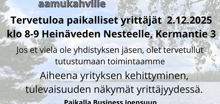 Tule mukaan yhteiselle aamukahville Heinäveden Nesteelle tiistaina 2.12. Aamun teemana on yrityksen kehittäminen ja tulevaisuuden näkymät. Mukana keskustelemassa Business Joensuun asiantuntijat.