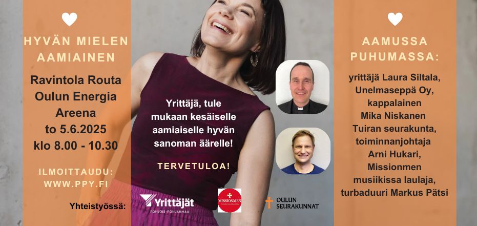 Aamun musiikkivieraana on taitava, kaunisääninen kanteletar Ellinoora Mäkelä ja hyvän mielen tarinoita yrittäjyysmatkaltaan kertovat Päivi ja Kari Isola. Puhumassa myös seurakuntapastori Lauri Hämeenaho.