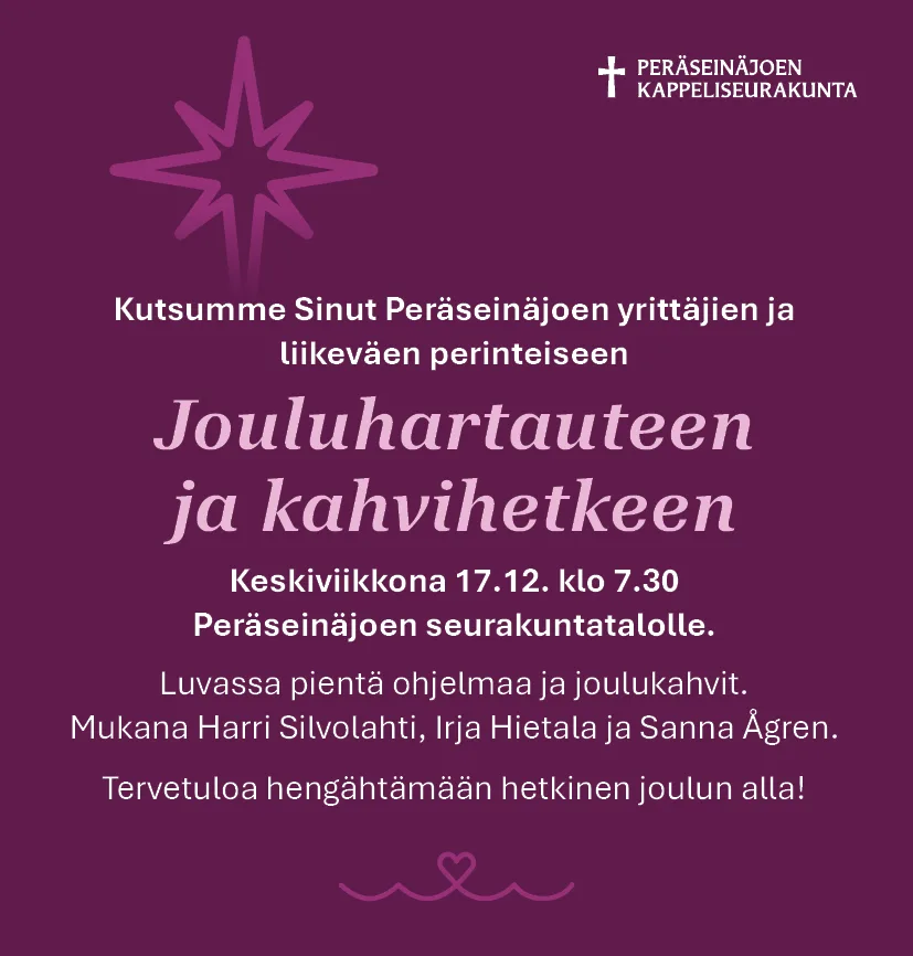 Peräseinäjoen kappeliseurakunta kutsuu Peräseinäjoen yrittäjät ja liikeväen perinteiseen jouluhartauteen ja kahvihetkeen keskiviikkona 17.12. klo 7.30 Peräseinäjoen seurakuntatalolle.