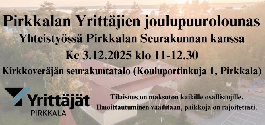 Tervetuloa Pirkkalan yrittäjien ja Pirkkalan seurakunnan yhdessä järjestämään lounastilaisuuteen nauttimaan joulupuurosta, kahvista ja tortuista, verkostoitumaan sekä laskeutumaan joulunvieton tunnelmaan yhdessä yrittäjä kollegoiden sekä Pirkkalan seurakunnan kanssa.