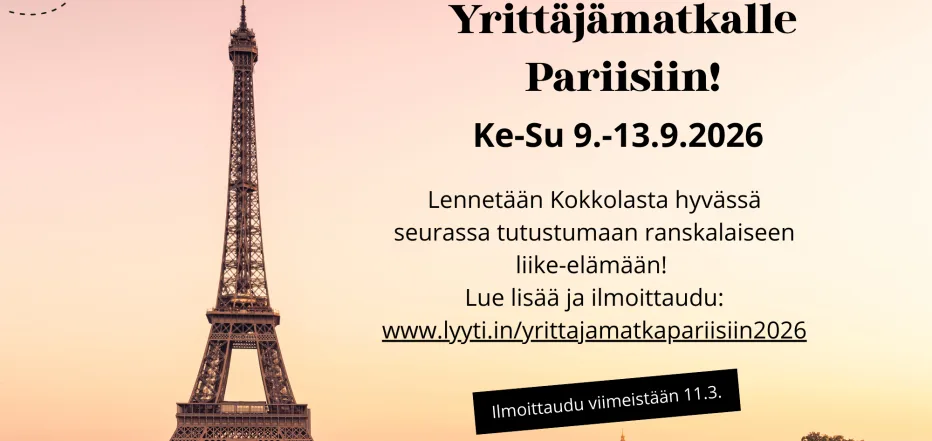 Lähde Keski-Pohjanmaan Yrittäjien kanssa syksyiseen Pariisiin! Viiden päivän yrittäjämatkalla yhdistyvät elämykset, verkostoituminen sekä tutustuminen ranskalaiseen liike-elämään ja markkinaan.