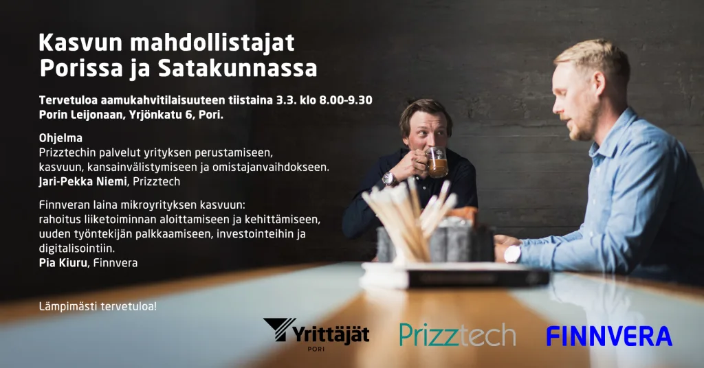 Tervetuloa aamukahvitilaisuuteen tiistaina 3.3. klo 8–9.30 Porin Leijonaan, Yrjönkatu 6, PoriOhjelmaPrizztechin palvelut yrityksen perustamiseen, kasvuun, kansainvälistymiseen ja omistajanvaihdokseenJari-Pekka Niemi, PrizztechFinnveran laina mikroyrityksen kasvuun: rahoitus liiketoiminnan aloittamiseen ja kehittämiseen, uuden työntekijän palkkaamiseen, investointeihin ja digitalisointiinPia Kiuru, Finnvera