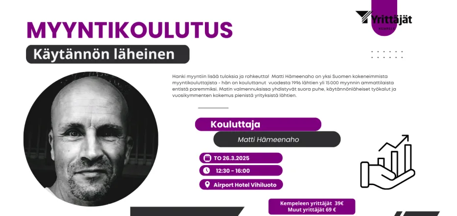 Tarjolla on käytännönläheinen myyntikoulutus pienyrittäjille Haluatko lisää kauppaa, parempia asiakaskohtaamisia ja toimivia myyntikeinoja jo seuraavana päivänä? Tule mukaan tehokkaaseen ja esimerkkien kautta etenevään koulutukseen, jonka vetäjänä toimii kokenut myyntiosaaja Matti Hämeenniemi.