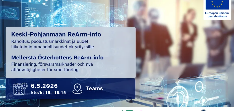 Tilaisuudessa saat ajankohtaista ja käytännönläheistä tietoa ReArm‑rahoituksesta, joka tukee pk‑yritysten investointeja, tuotantokapasiteetin kasvattamista, liiketoiminnan kehittämistä sekä kansainvälistymistä.