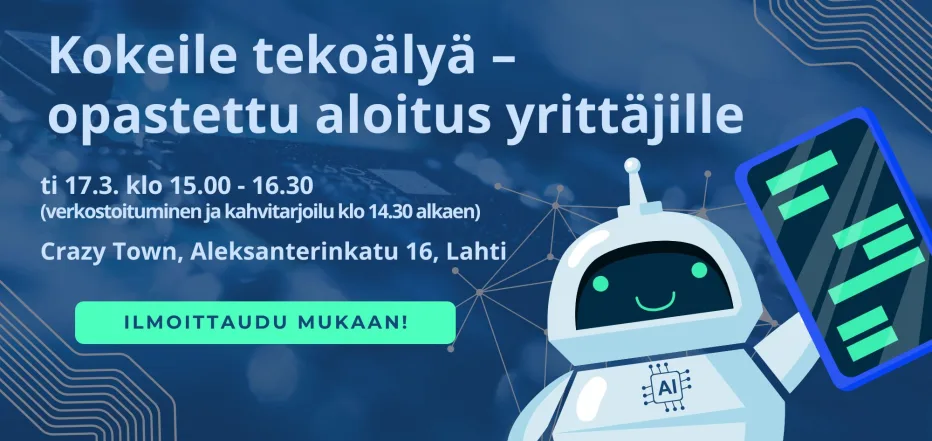 Järjestämme ti 17.3. klo 15.00-16.30 (verkostoituminen ja kahvitarjoilu klo 14.30 alkaen) Lahden Crazy Townin tiloissa tekoälyn alkeiskoulutuksen yrittäjille, joille tekoälyn käyttö on vielä vähäistä tai kokonaan vierasta.