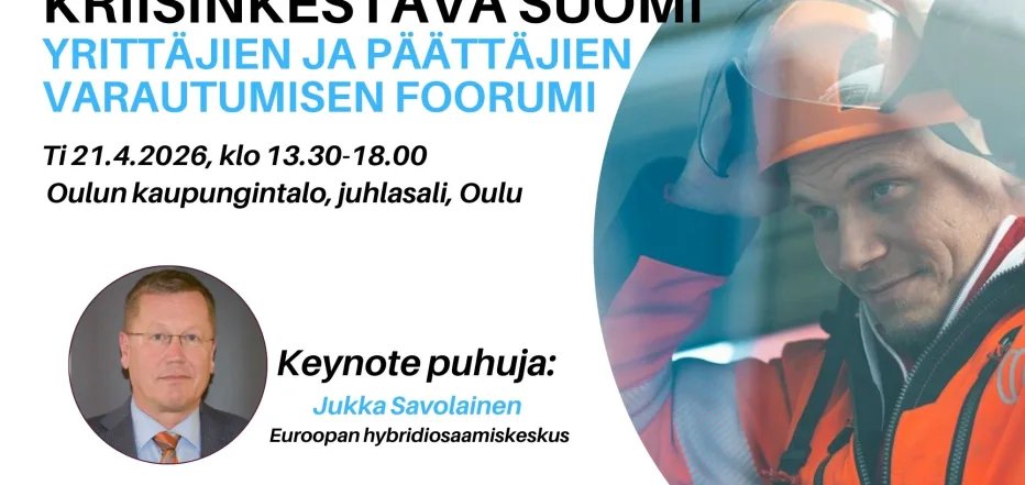 Tilaisuus on tarkoitettu yrittäjille, yritysten johdolle, kuntapäättäjille, yritysten sidosryhmille sekä varautumisesta vastaaville viranomaisille.