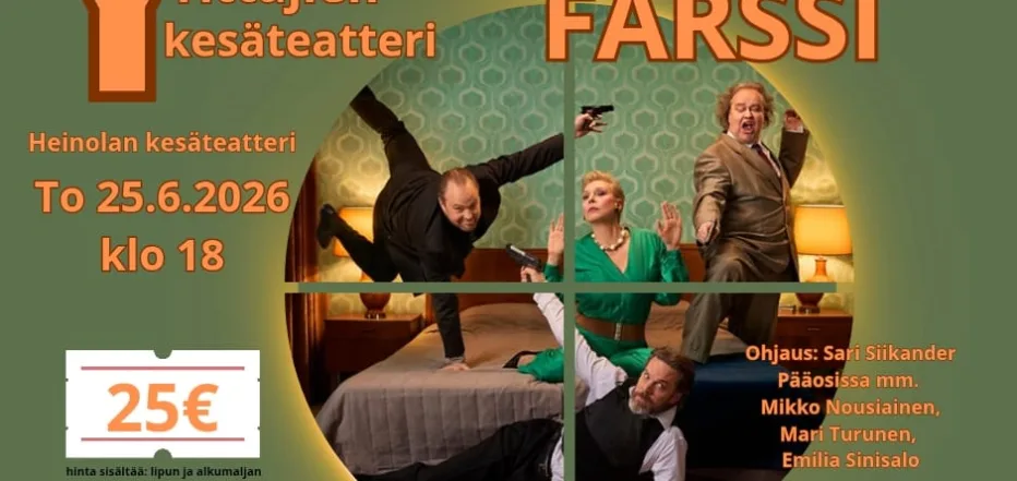 Matkustamme paikalle bussilla, nauramme Kaikkien aikojen farssi -esitykselle ja alkuun nostamme maljan kesälle yhdessä lähialueiden Yrittäjien kera. Näytelmän loputtua matkaamme takaisin Lahteen bussilla.